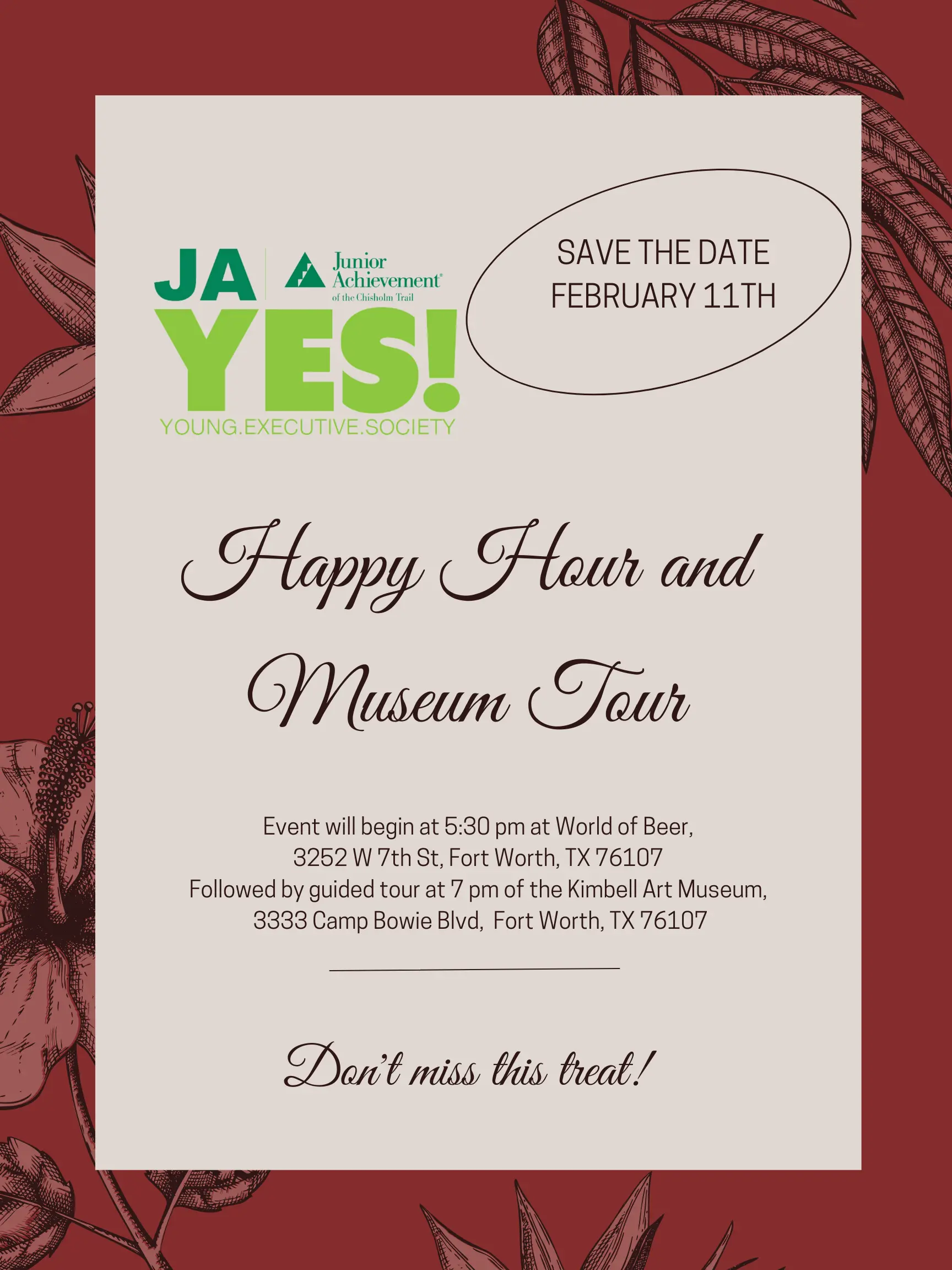 Well start happy hour at World of Beer, and then walk to the Kimbell for the tour starting at 7pm. In addition to networking, well be discussing the upcoming JA YES! signature event Whiskey & Wine.